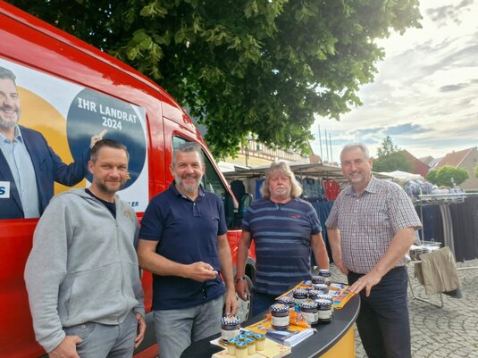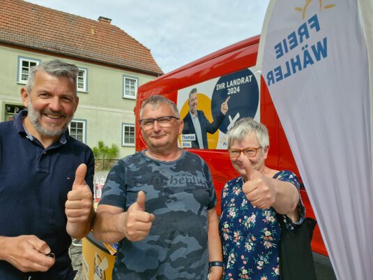 Donnerstags ist Markttag in unserer Gemeinde. Diesen Tag ließen sich Thomas Ahke (Landratskandidat der FWH Unstrut-Hainich) und unser Bürgermeisterkandidat, Matthias Hartwig, nicht entgehen, um am Vormittag mit den Bürgern persönlich vor Ort ins Gespräch zu kommen. Auf dem Rathausplatz präsentieren beide Bewerber die Wahlprogramme und auch Ziele der FWH für den Ort und den Kreis.